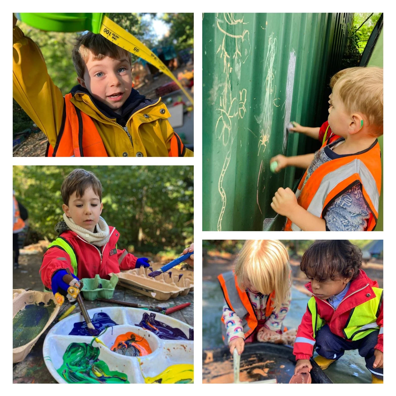 We have had a glorious week of exploring the forest through our senses and extending our vocabulary. Sticky, orange, ooblek with its combined dribblyness and stiff qualities, perplexed and excited our curious minds. We also enjoyed tweezer work with natural elements like smooth conkers, rough pine cones, small, hard, ash keys, small greenish acorns and soft feathery grasses. As our autumn leaves have been changing colour and falling to our forest floor, we have enjoyed feeling their textures. Some are large and papery thin, others are crispy and crunchy having fallen from the trees a few days ago. We have enjoyed reconditioning some old, dry, clay and squishing the soaked clay between our fingers until our hands were completely covered and grey. Sand has also been present as the younger children have explored the fine grains and cool qualities. Our vocabulary has been enhanced and extended through our play and exploration.