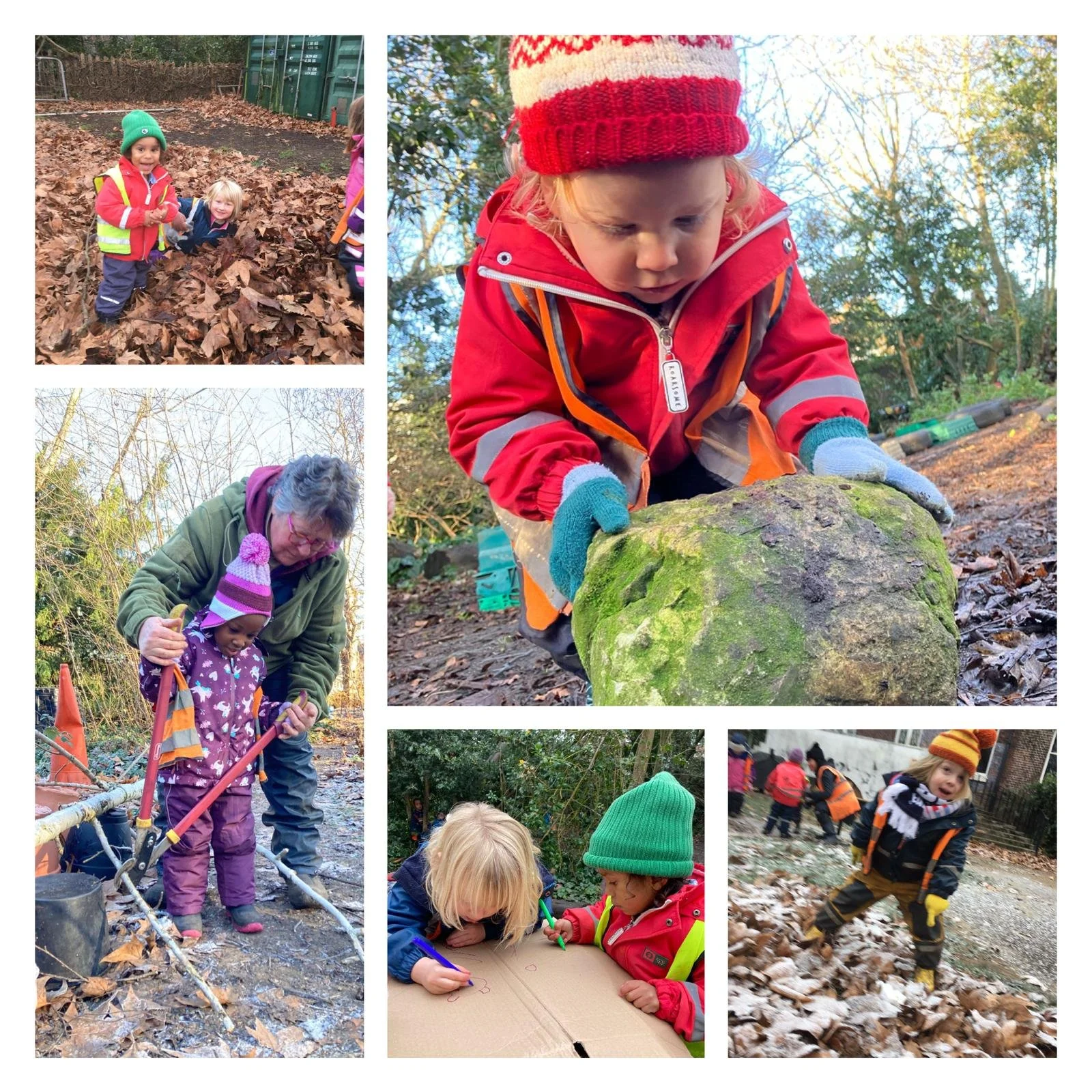 We have wrapped up warm with snoods, gloves, hats, winter wellies, thermals and our winter waterproofs and really enjoyed the crisp, crunchy, winter weather. We have found frozen puddles, frost encrusted autumn leaves and it snowed too much to our delight! We all tried to catch a snow flake on our tongues but it was a tricky task.