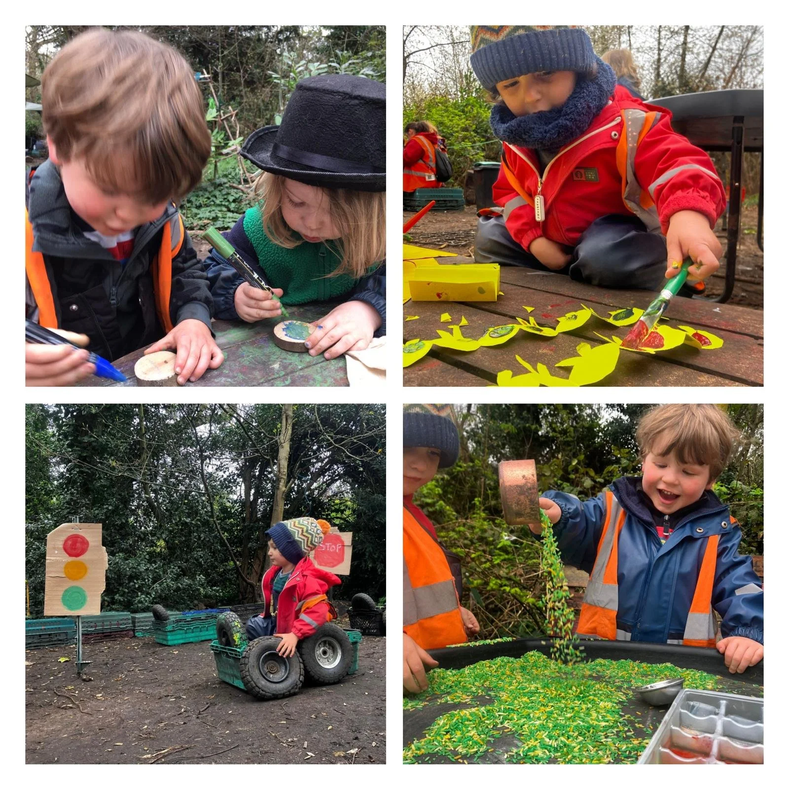 On another occasion we had a sawing lesson, we learnt how to hold the saw and be safe as we cut discs of wood from the branch of our plane tree. Once we had sawn the discs, which we call cookies, the children had a great time colouring in the wood with wonderful colourful patterns.