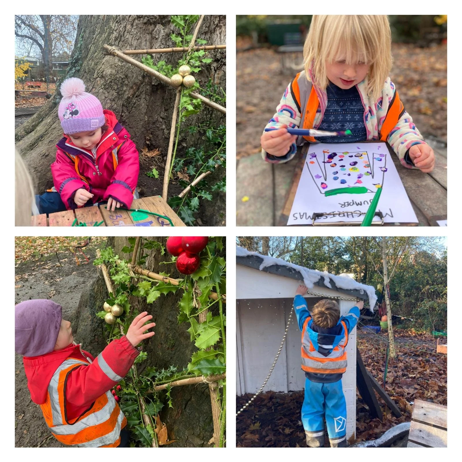 Little Forest Folk Twickenham has been buzzing with preparations for this afternoon’s family Christmas/Winter party all week. We have been building a giant star from branches and holly sprigs from the forest, as well as hanging decorations upon the star and hanging baubles around the forest. We have painted a huge cardboard box snowman, a row of gingerbread houses made from recycled boxes, gnomes made from planks of wood wearing spare hats, scarfs and so many more things!