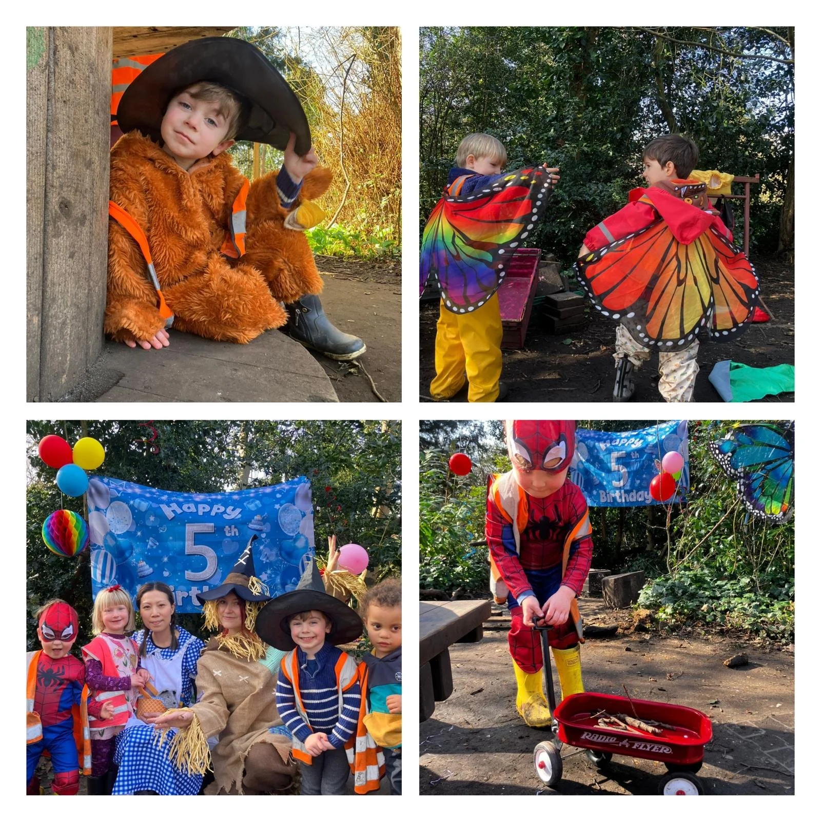 We have been acknowledging birthdays as children turn 3, 4 and 5, as well as celebrating World Book Day and the educators and children have dressed up as their favourite characters. We had Matilda, Dorothy and the Scarecrow, a monkey, a vampire, 2 batmans, Little Miss Sunshine, 2 cats and many more in the forest! We read all the favourite books that the children had brought in, as we role played the stories and ran about the forest. The batman (x2) enjoyed painting pictures and then rushing off to save people, the cats meowed while gluing and sticking and the monkey enjoyed stepping up as a waiter during snack time and served his friends.