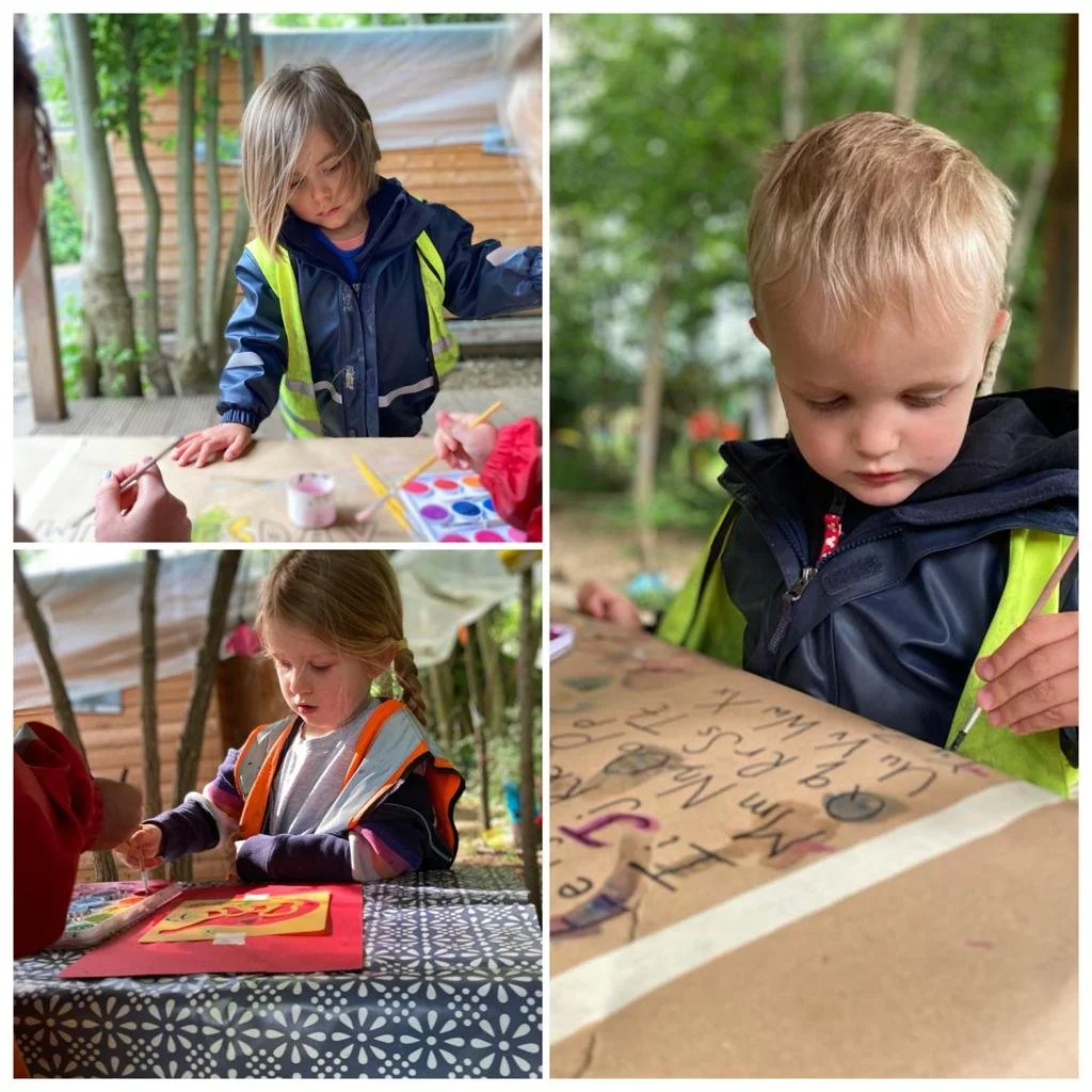 This is an activity that the children have been asking to continue with a lot this week; so, each day we have added something new to the activity. One morning the children used stencils to paint over and reveal their prints. Another morning, we had one of our forest posters set up with letters of the alphabet, numbers and days of the week for the children to play fun games with and practice the shapes of our letters “I can find all the sounds in my name!”. We’re excited to incorporate more water colour use in different activities in future!