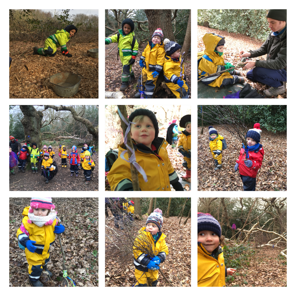 Once again our amazing set up teams have been creating interesting, diverse and holistically challenging set-ups designed to build the children’s social and teamwork skills and to make the children look closely at the resources around them in the forest. One morning, the children followed a trail of purple ribbons, helping each other to collect one ribbon each. We arrived to a Witch’s Den along the path to discover that a Witch had fallen into trouble and had broken her broom! We set out to find materials in the forest around us to create our very own brooms! This was inspired by one of our favourite stories, Room on the Broom, from which the children can join in wholeheartedly with lots of key phrases - Whoosh! She was gone!