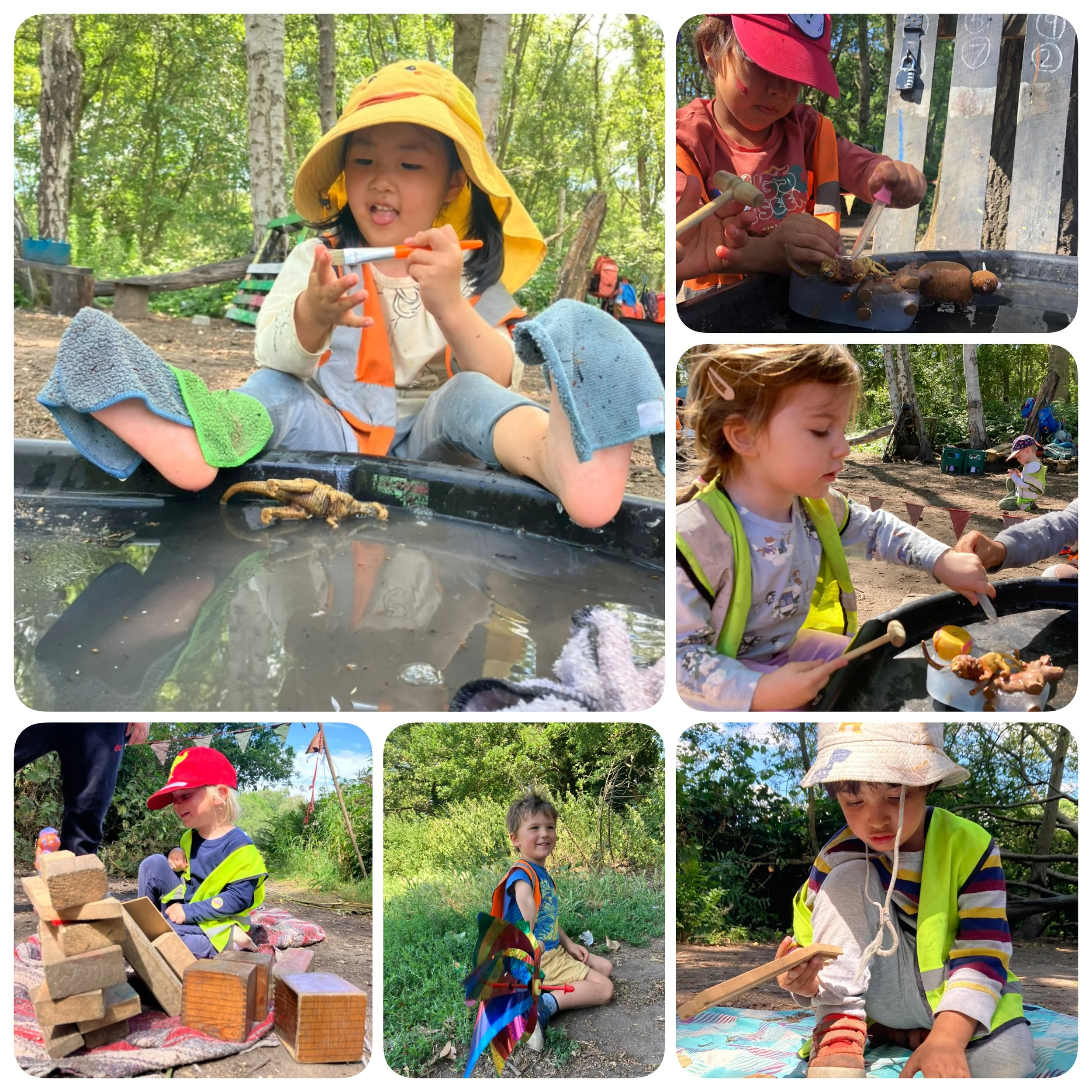At Wimbledon, our hottest activities of the day are our walk into and out of the forest, due to the lack of tree canopy walking across the meadows, but we did not fret, as our amazing educators set up cooling activities to take part in from the get go! One sunny afternoon after lunch, we used some hand washing water to create a foot spa for our non sleepers! The children were welcomed with cold wet flannels, a picnic blanket and calming sensory brushes to play with. It had a truly tremendous effect on all those who participated. They took off their shoes and socks and perched down round the edge of our big tuff tray. Using flannels and paintbrushes, the water was swished around and squeezed on top of their feet.