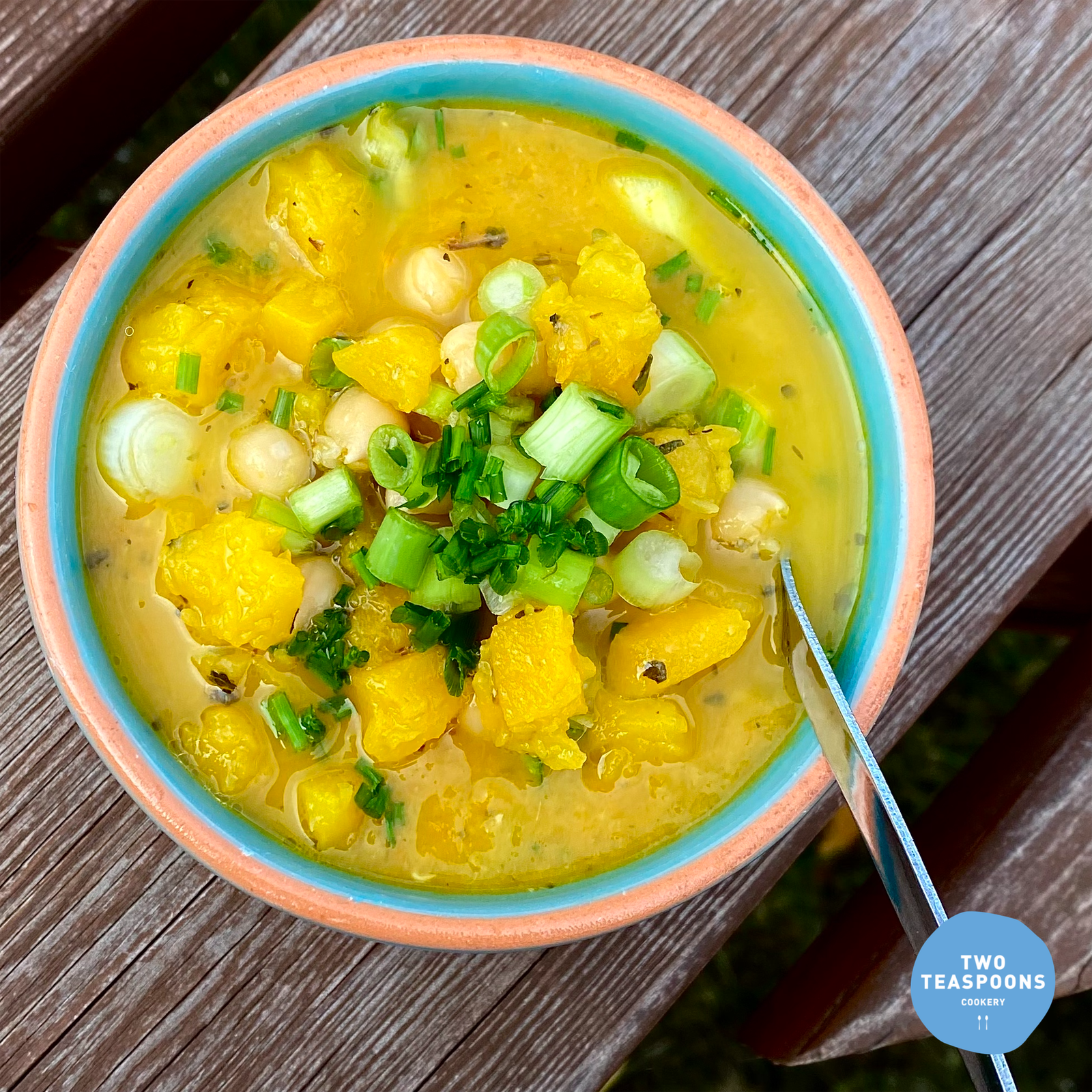 A delicious blended meal of leeks, potatoes, sweet potatoes, carrots, garlic, bay and red lentils with herby chickpeas, slow cooked butternut squash, spring onions and chives stirred through at the end.
